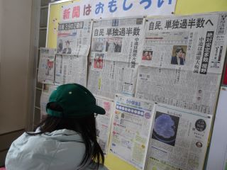 子供たちは一面トップ記事の見出しの文字の読み比べ