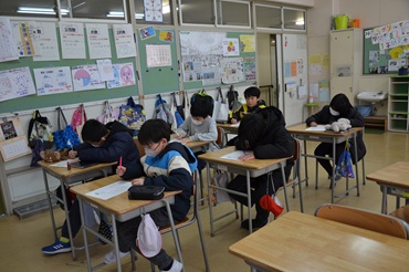 「たてわり感謝の会」に向けて、4年生と5年生が朝の活動の時間に