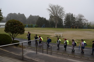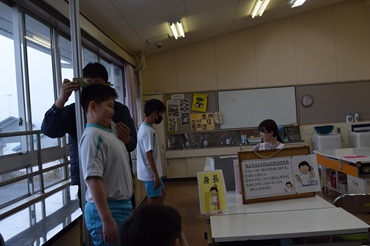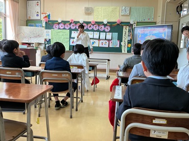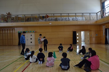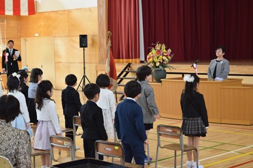 5名の先生方をお迎えして、披露式を行いました。6年生が、お迎えの言葉を述べたあと、全校児童で「どんぐりころころ」を合唱しました。