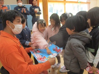 ぞうくみは、いつも避難訓練で消防車を見せてくれる消防士さんに