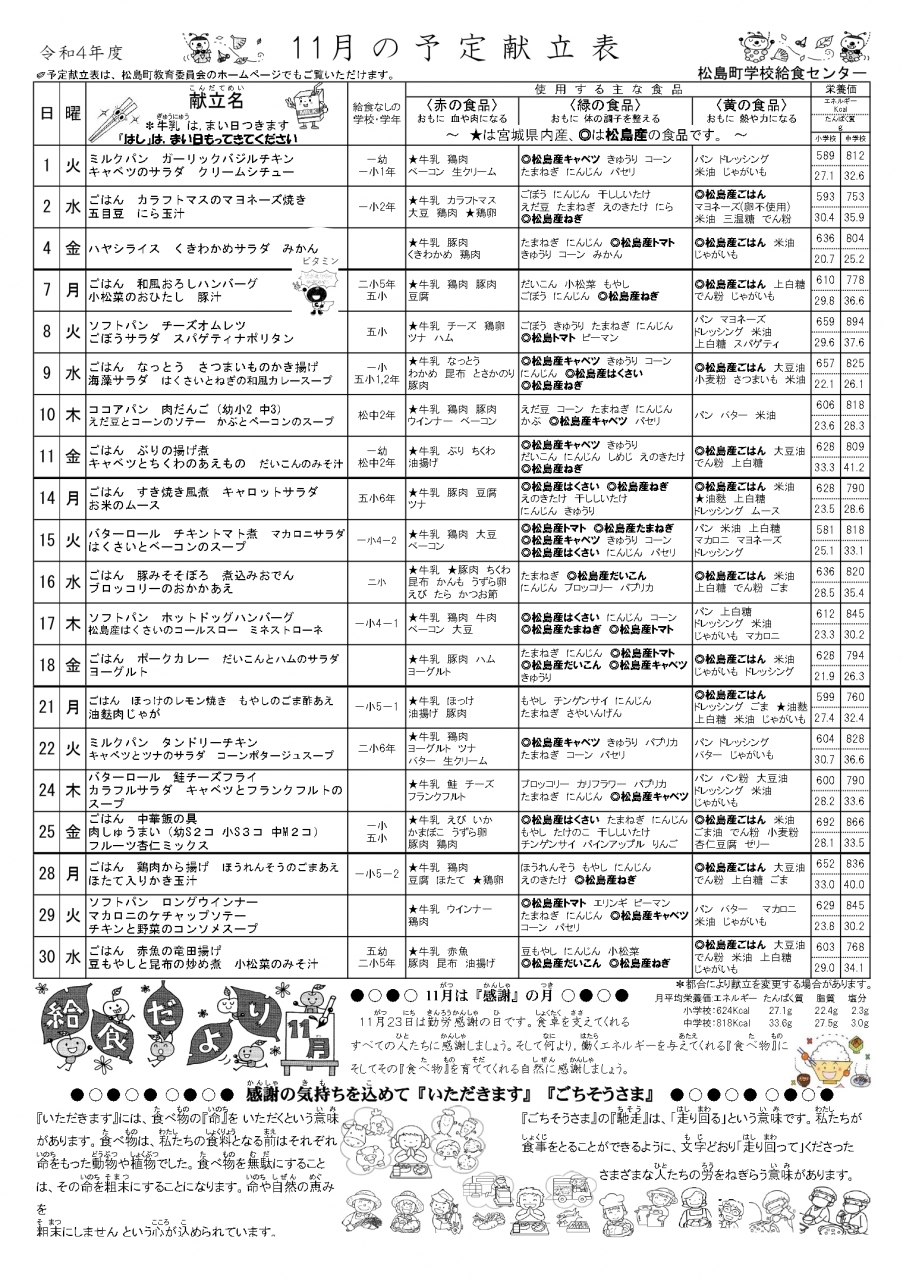 松島町学校給食センターでは、「今日の給食」や毎月の「予定献立表」、「一口メモ」などを発信しております。