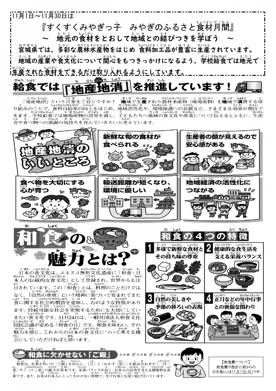 特に「一口メモ」では、その日の献立にまつわるお話を掲載しておりますので、様々な料理、色々な食材や栄養素等の知識、地域の食文化などを学ぶことができます。ぜひご覧いただき、ご家庭でも給食のお話や食に関する話題などで、児童生徒の「食への関心」を高めていただければ幸いに存じます。