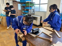 1年生の技術では、かんなやのこぎりを使用し、本棚等の制作を行っていました。
