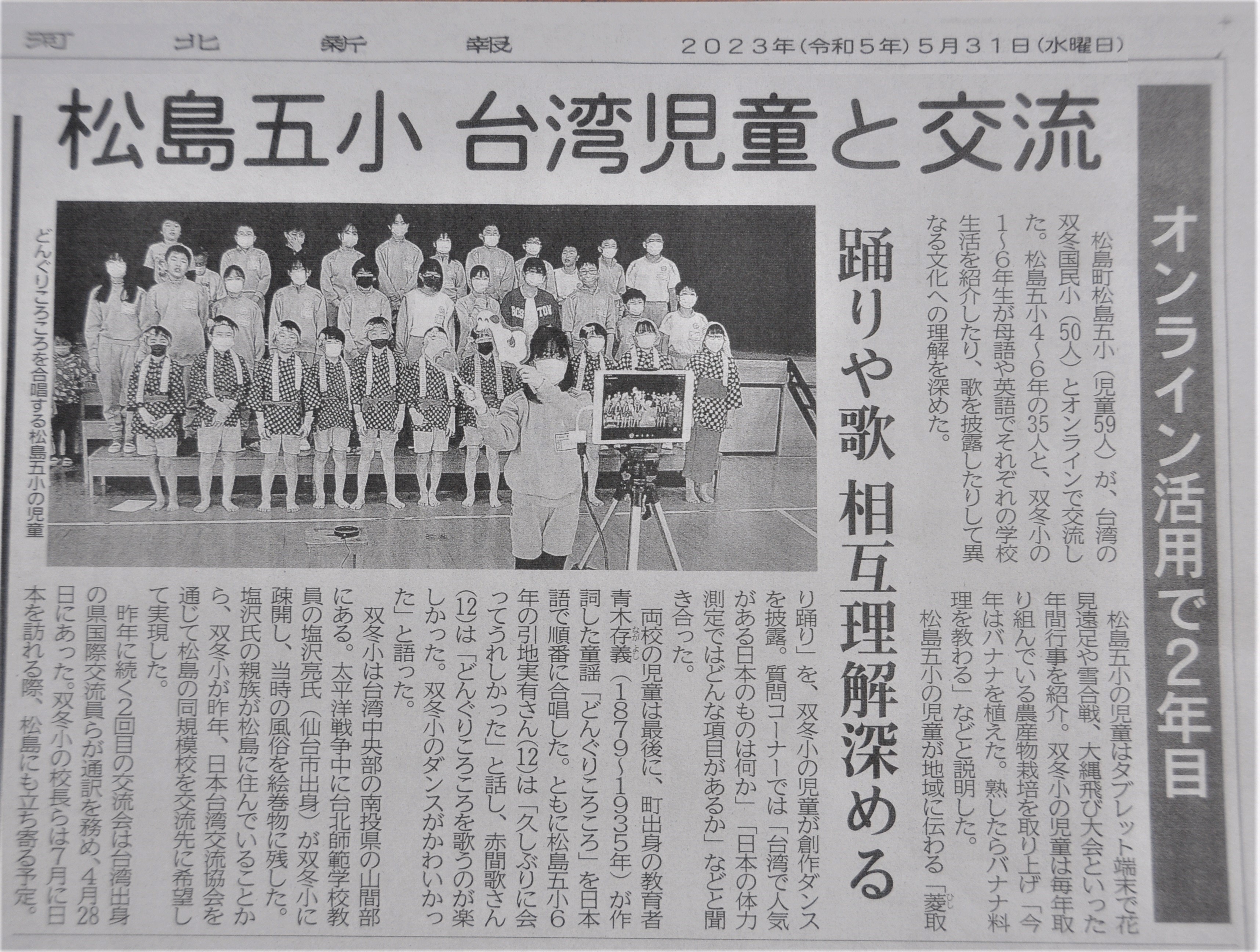 令和5年5月31日付けの河北新報に「松島五小 台湾児童と交流」として紹介されました。今後も、台湾双冬小学校とのつながりを大切にし、松島や松島第五小学校区の良さを伝えていきたいと思います。