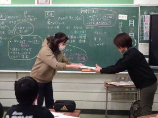 担任から子供たちが学習でまとめた資料を越中谷記者