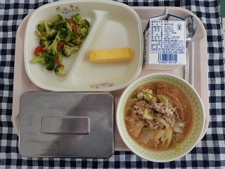 今日の給食は、ごはん、たまご焼き、ブロッコリーのおかかあえ、すき焼き煮、牛乳です。