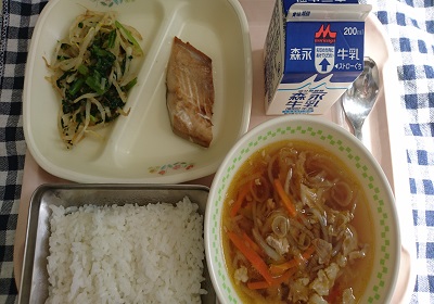 今日の給食は、ごはん、さばの照り焼き、小松菜のごまあえ、ひきな汁 です。