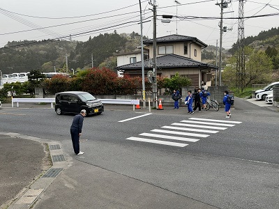 【学年主任の先生が横断歩道の渡り方の指導中】