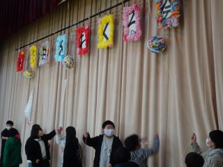 4年生が制作したくす玉を6年生の代表が割りました。