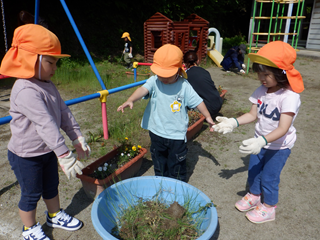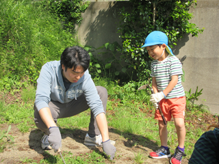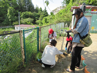 園庭をきれいにしようと、一生懸命なみんな