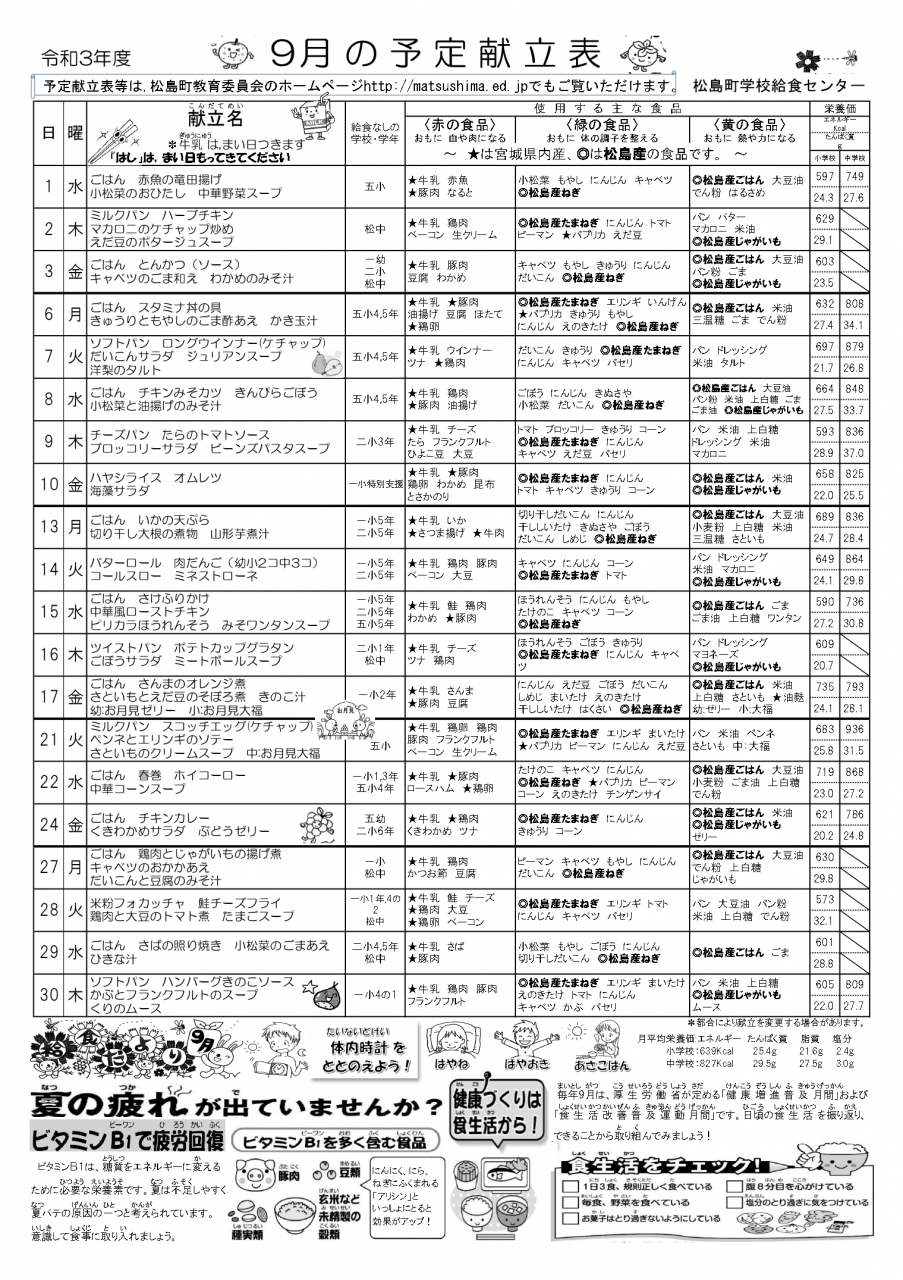 松島町学校給食センターでは、「今日の給食」や毎月の「予定献立表」、「一口メモ」などを発信しております。