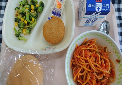 今日の給食は、丸パン、えびカツ(タルタルソース)、ブロッコリーとコーンサラダ、スパゲティナポリタン です。