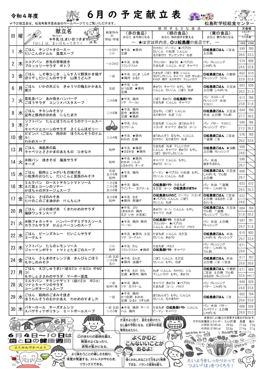 松島町学校給食センターでは、「今日の給食」や毎月の「予定献立表」、「一口メモ」などを発信しております。