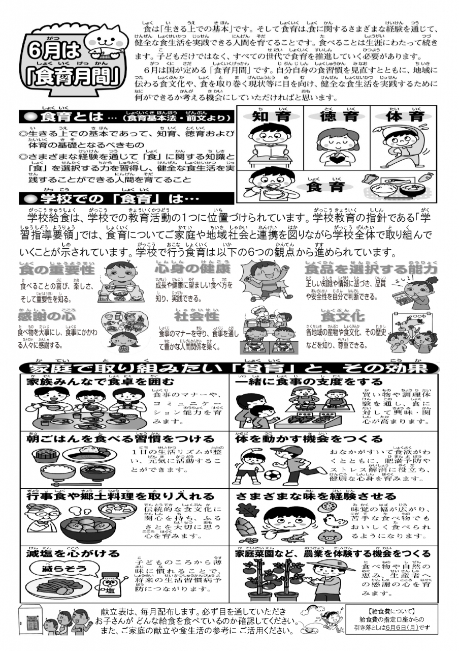 特に「一口メモ」では、その日の献立にまつわるお話を掲載しておりますので、様々な料理、色々な食材や栄養素等の知識、地域の食文化などを学ぶことができます。ぜひご覧いただき、ご家庭でも給食のお話や食に関する話題などで、児童生徒の「食への関心」を高めていただければ幸いに存じます。