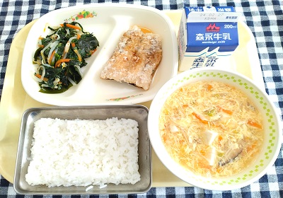 今日の地場産物は、松島産ごはん、松島産ねぎ、たまご、牛乳です。