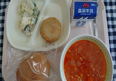 今日の給食は、丸パン、ハムチーズフライ、キャベツとツナのサラダ、ミネストローネ です。