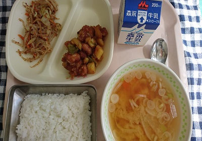 今日の給食は、ごはん、鶏肉とじゃがいもの揚げ煮、キャベツのおかかあえ、だいこんと豆腐のみそ汁 です。