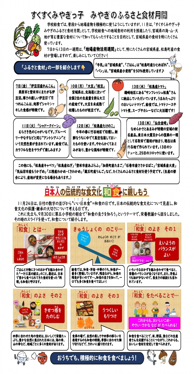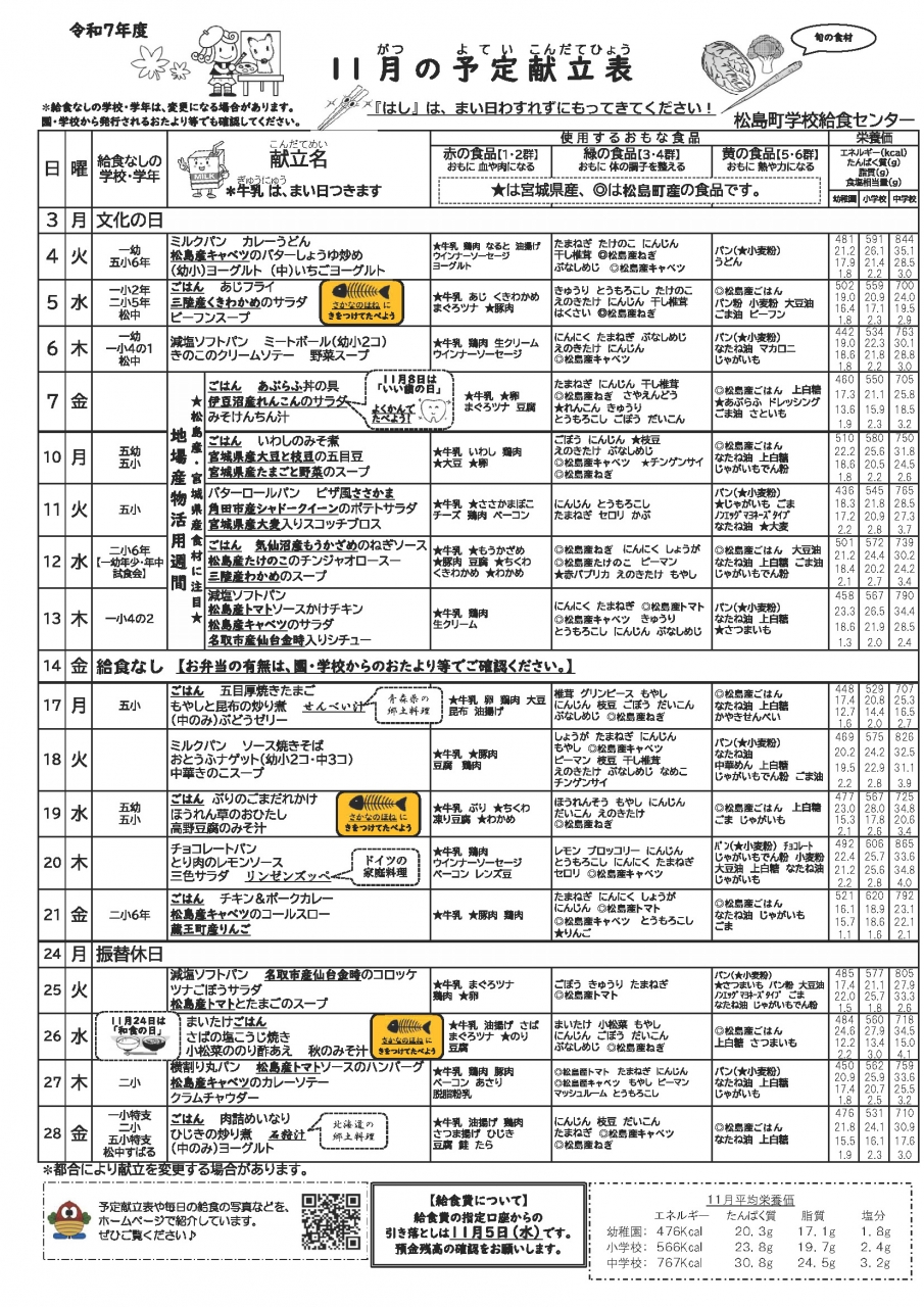 松島町学校給食センターでは、「今日の給食」や毎月の「予定献立表」、「一口メモ」などを発信しております。