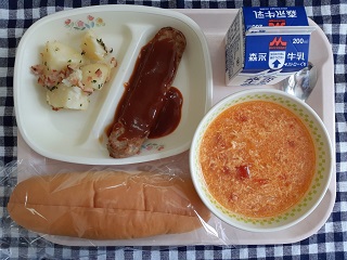 今日の給食は、ソフトパン、ホットドッグハンバーグ、ジャーマンポテト、トマトとたまごのスープです。