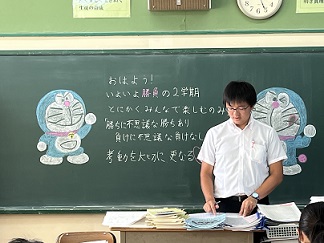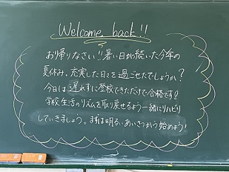 始業式を終え、各学級では、学級活動が行われ、2学期の目標や係決め、席替えをしたクラスもありました。担任からのメッセージを眺め、真剣に話を聞く生徒や志高い目標を掲げる生徒の姿を見ることができました。昨日の実力テストも一生懸命取り組んでいました。