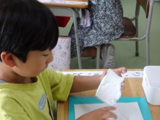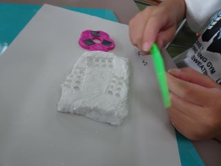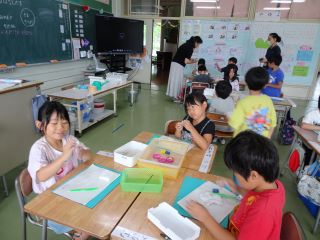 7月11日(金)1年生が図工の学習で紙粘土を使い、スタンプ遊びをしました。