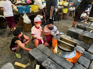 ▲薪で炊き上げる炊飯は火起こしも火加減も難しく,子供たちも真剣そのものです!!