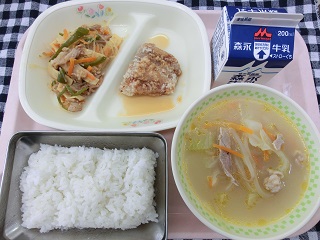 今日は、たけのこのごま油炒めはたけのこと豚肉とはるさめの食感が良く、白湯野菜スープは野菜たっぷりで、また、さんまのかば焼きはカラッと揚がっており、野菜、肉、魚と栄養バランスのとれた給食でした。