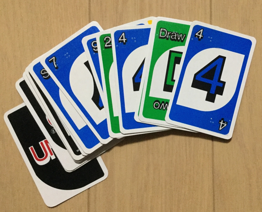 下の写真は、どちらかというと日本よりアメリカで流行っているカードゲームで「ウノ」と言います。