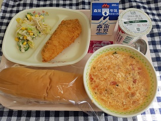 今日の給食は、ソフトパン、サケのチーズフライ(ソース)、切干大根のサラダ、トマトとたまごのスープ、(中のみ)復興仙台いちごヨーグルト、牛乳です。