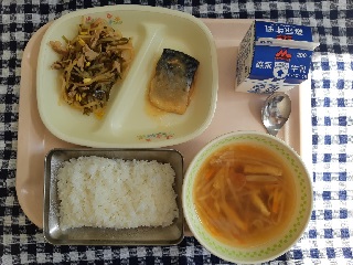 今日の給食は、ごはん、さばのみそ煮、昆布と豆もやしの炒め煮、ひきな汁、牛乳です。