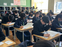 本日、1.2年生が標準学力検査、3年生が実力考査(5教科)を実施しました。どの学年も真剣に取り組む様子が見られました。