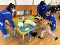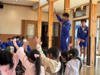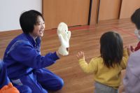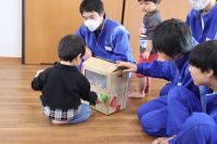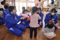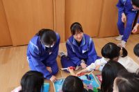 3年生家庭科の授業で、松島町「認定こども園 めぶきの森」を訪問し交流会を行いました。事前に園児の年齢に合わせて作成した遊具を持参し、子どもたちと一緒に楽しく過ごしていました。