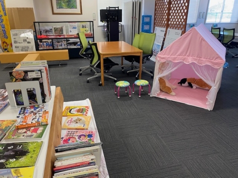 交流館の2階に小さい子が遊べるスペースがあります。絵本もあります。天気の悪い日にもご利用いただけます。