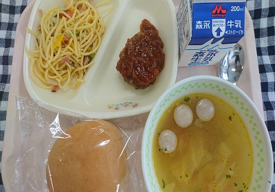 今日の給食は、丸パン、ハンバーグトマトソース、スパゲティソテー、キャベツとフランクフルトのスープ です。