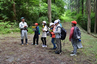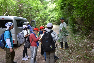 現地では森林組合の方に、木の特徴等について説明をしていただきました。また、チェーンソーを使って実際に木を切り倒すところも見学しました。
