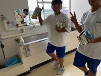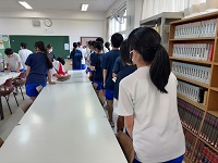 昼休みの図書室の様子です。本を借りるため、長蛇の列になっていました。