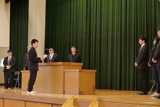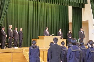 本日,生徒と保護者・卒業生の方々の参列のもと,ご退職またご転任される7名の職員の離任式を行いました。生徒会長の尾口君からは,心温まるお別れの言葉,生徒会役員からは花束が贈られました。7名の職員には,松島中学校で生徒に寄り添いながら指導をしていただきました。今後は健康に留意され,次の職場で更にご活躍されることをお祈りしています。