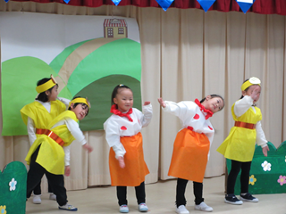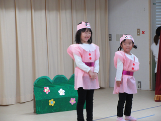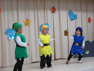 今日は発表会がありました  どのクラスもたくさん練習した ダンス、オペレッタ、劇を おうちのみなさんにみてもらいました  〈はじめのことば〉 たんぽぽ組さん、すみれ組さんの 「♪はじまるよ」の手遊びで発表会スタート   〈合奏〉 さくら組さんは小太鼓を使って合奏に挑戦しました   〈どんぐりマン〉 たんぽぽ組さんのダンスとっても可愛かったです  バック絵のどんぐりは自分たちで作りました☆  〈おひさまぱんころりん〉 すみれ組さんのオペレッタ!とても楽しいお話でした      自分の役になりきって楽しく演じていました   〈ハイホー〉 たんぽぽ組さんのダンス! 曲中に宝石を探しに行く演出がありました     最後は宝石をもって「ばいば~い  」 初めての発表会頑張っていました  | | | | |