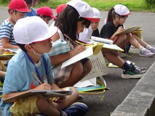 松島長松苑で真剣に話を聞き、メモする子供たち。