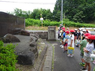 松五小の「どんぐりころころの碑」前で作詞をした青