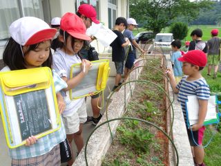 トマトが栽培されていて、子供たちは興味深く見てい