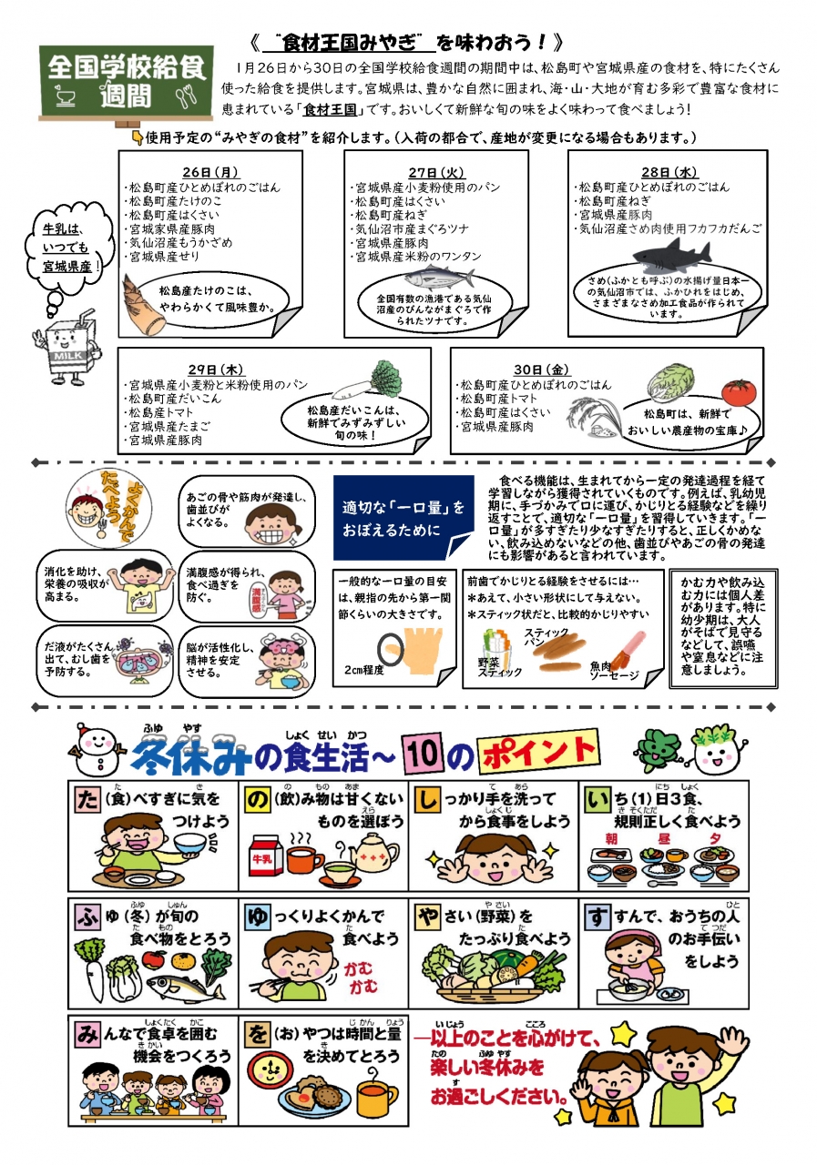 特に「一口メモ」では、その日の献立にまつわるお話を掲載しておりますので、様々な料理、色々な食材や栄養素等の知識、地域の食文化などを学ぶことができます。ぜひご覧いただき、ご家庭でも給食のお話や食に関する話題などで、児童生徒の「食への関心」を高めていただければ幸いに存じます。
