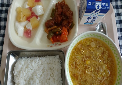 今日の給食は、ごはん、酢豚、みそ中華野菜スープ、フルーツ杏仁ミックス です。