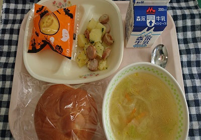 今日の給食は、ミルクパン、ジャーマンポテト、チキンコンソメスープ、かぼちゃ蒸しケーキ です。
