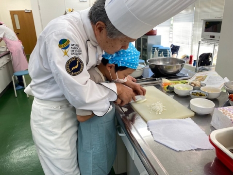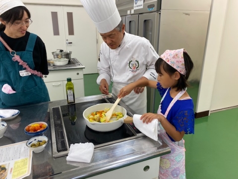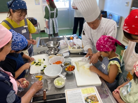 7月29日に交流館で開催された親子料理教室では、宮城県の食材王国みやぎ「伝え人」事業により派遣いただいた講師の鹿野佐一さんに地産地消や地元食材について、料理を作ってくれる人への感謝などを学びました。今回は、松島町食生活改善推進員さんの協力もあり、親子とプラスアルファの交流と調理による五感が刺激される楽しい教室となりました。調理のコツも教えていただき、レベルアップ!!鹿野さんの丁寧な指導に感謝します。