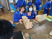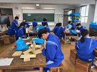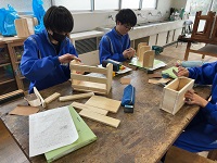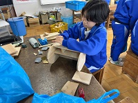 木材加工の授業です。組み立てが終わり、ヤスリで磨いている生徒たちが