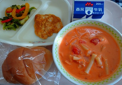 今日の給食は、バターロール、タンドリーチキン、ブロッコリーサラダ、ポタージュミネストラ です。
