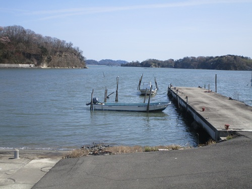③ 陸前富山駅の踏切を超えると、防波堤の内側にある船着き場に行