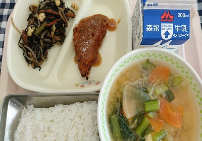 今日の給食は、ごはん、まぐろのごまみそかけ、ひじきと大豆の煮物、厚揚げと小松菜のみそ汁 です。