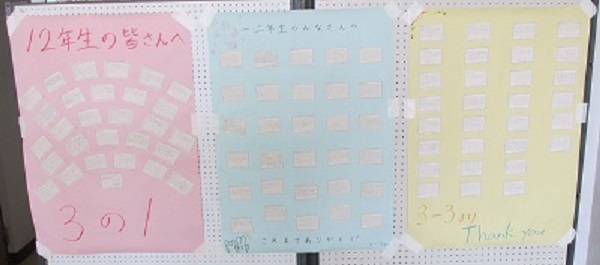 先日行われた、3年生送る会の「1・2年生にお礼のメッセージ」が中央昇降口に掲示されました。3年生の感謝の気持ちが伝わってきました。
